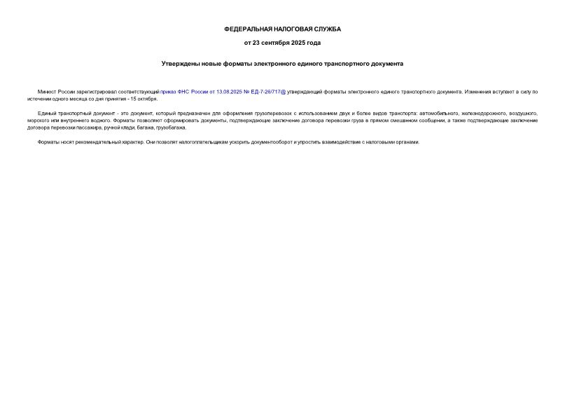 Статус: Информационный документ Текст документа: присутствует в коммерческой версии NormaCS Утвержден: ФНС России; Федеральная налоговая служба, 23.09.2025 Обозначение: Информация Наименование: Утверждены новые форматы электронного единого транспортного документа Дополнительные сведения: доступны через сетевой клиент NormaCS. После установки нажмите на иконку рядом с названием документа для его открытия в NormaCS