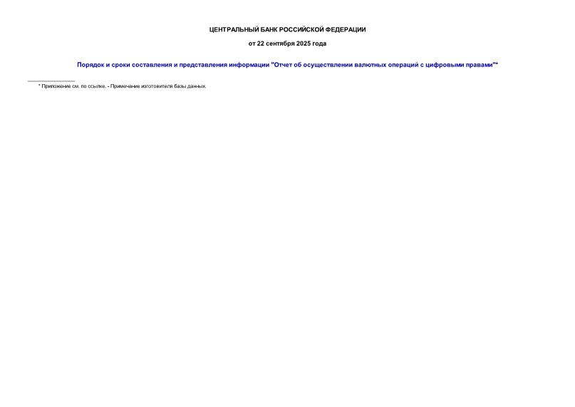 Статус: Информационный документ Текст документа: присутствует в коммерческой версии NormaCS Утвержден: Банк России; Центральный банк Российской Федерации, 22.09.2025 Обозначение: Информация Наименование: Порядок и сроки составления и представления информации "Отчет об осуществлении валютных операций с цифровыми правами"* Дополнительные сведения: доступны через сетевой клиент NormaCS. После установки нажмите на иконку рядом с названием документа для его открытия в NormaCS